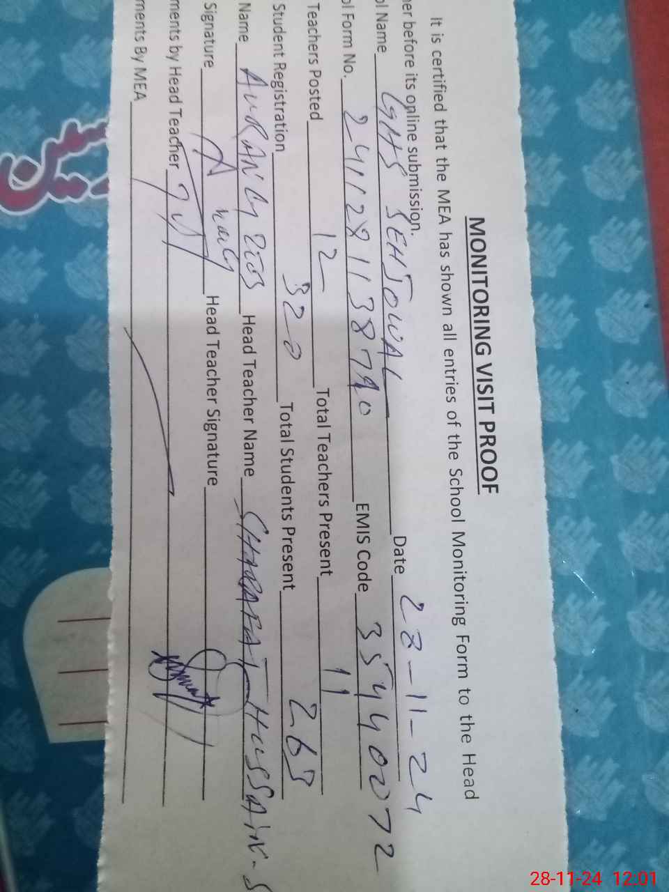| Attendance Register | Head Teacher | MEA with School | Visit Proof |