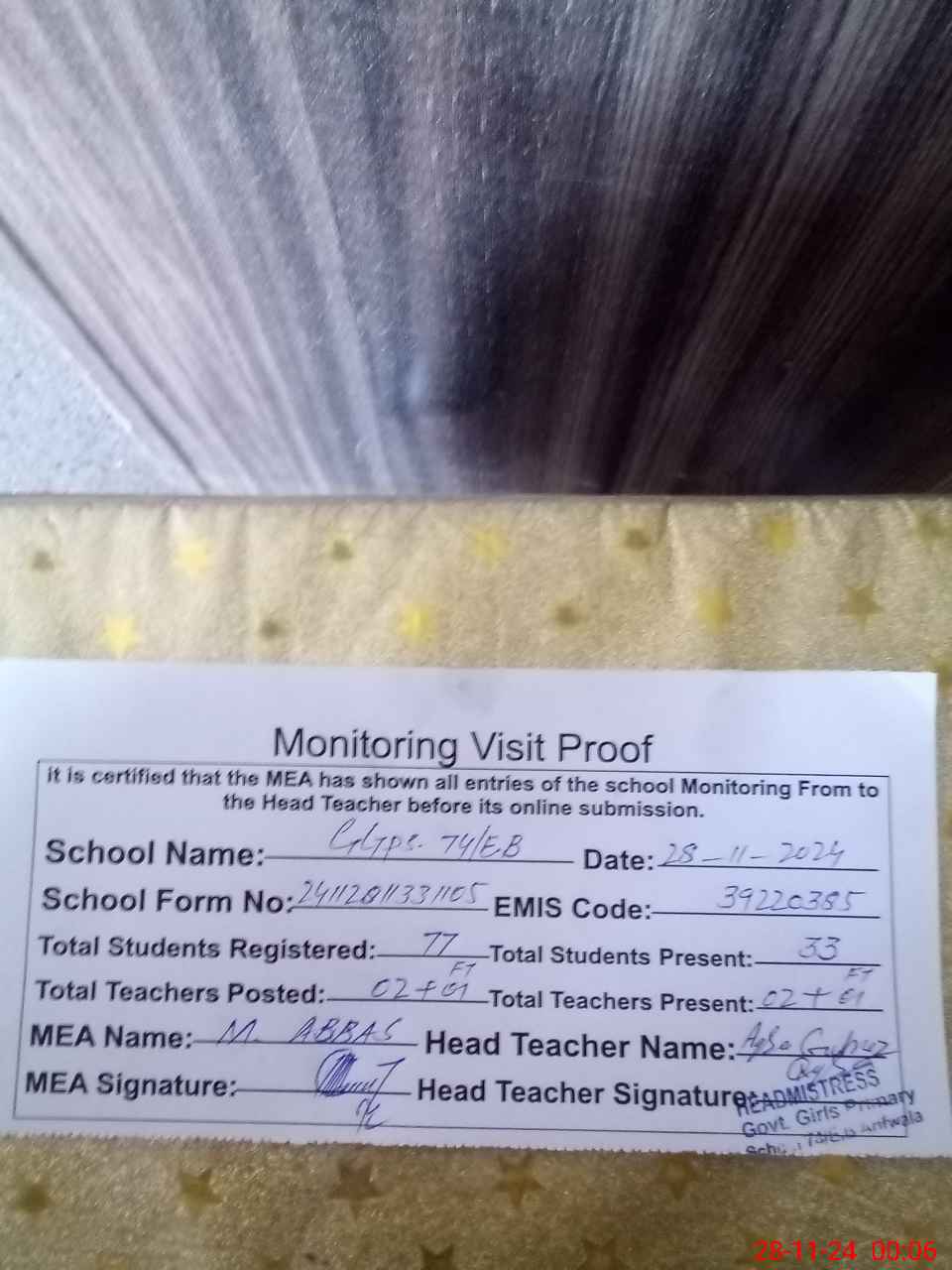 | EMIS Code: 39220385 | Name of School: GGPS 74 EB ARIFWALA | |||