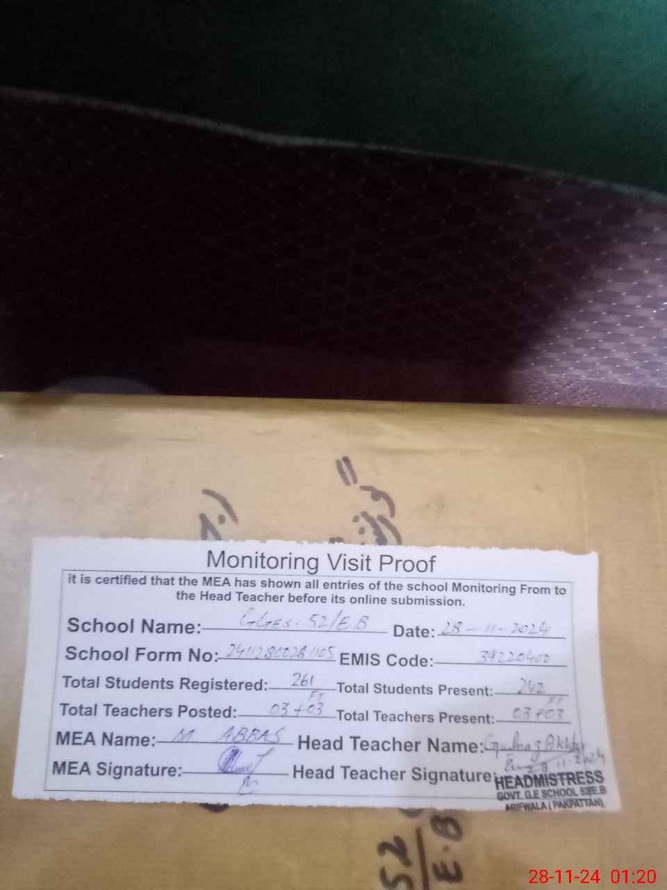 | Certified that this School was Inspected by the Undersigned MEA/DMO Today and the Information Stated Above is as Per Record. | |||||