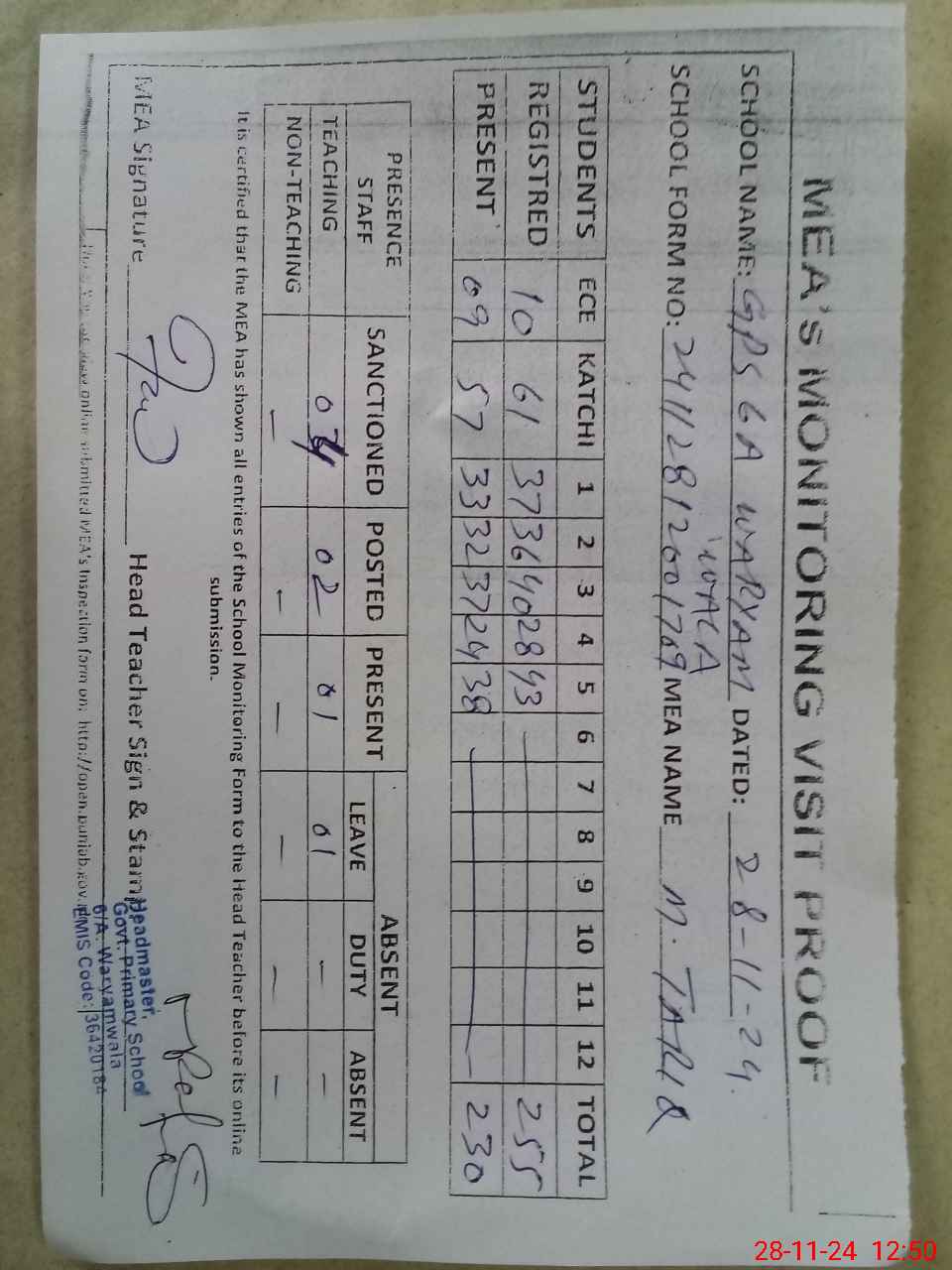 | Attendance Register | Head Teacher | MEA with School | Visit Proof |