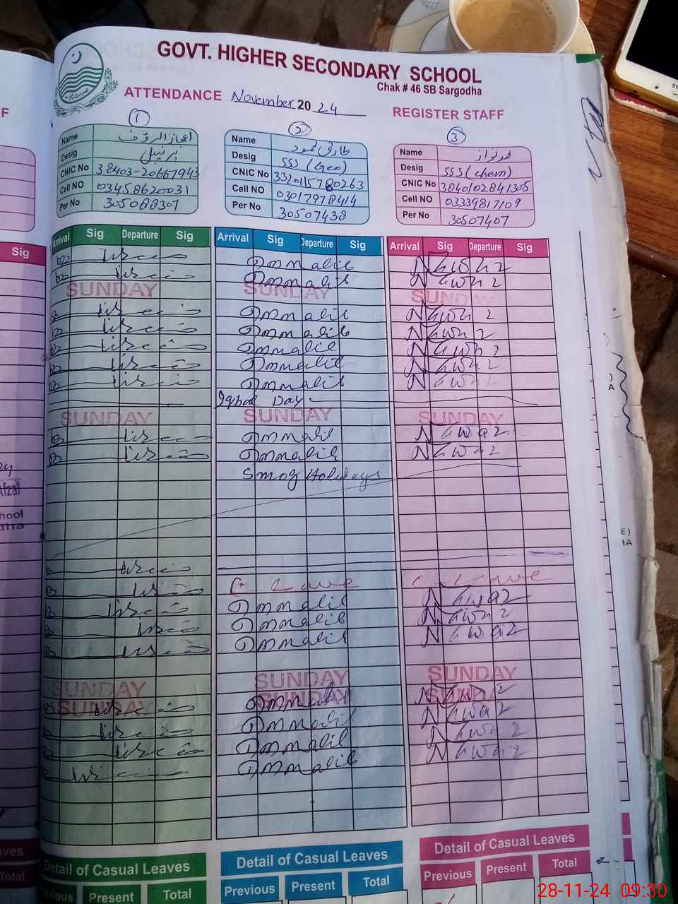 | CNIC | Full Name | Designation | R/C | Absence during last cal. month |