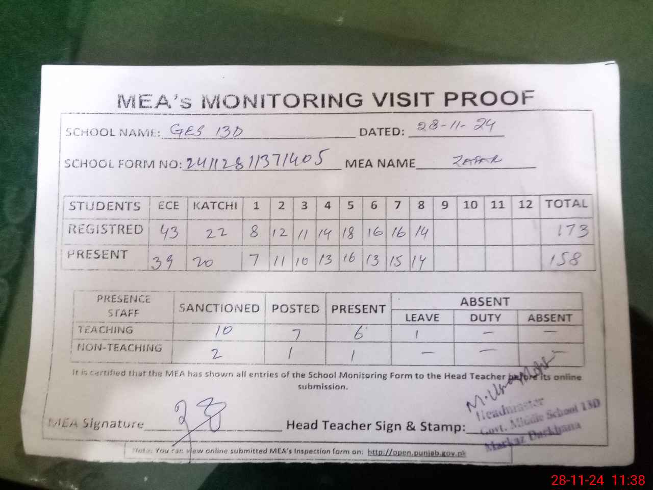 | Attendance Register | Head Teacher | MEA with School | Visit Proof |