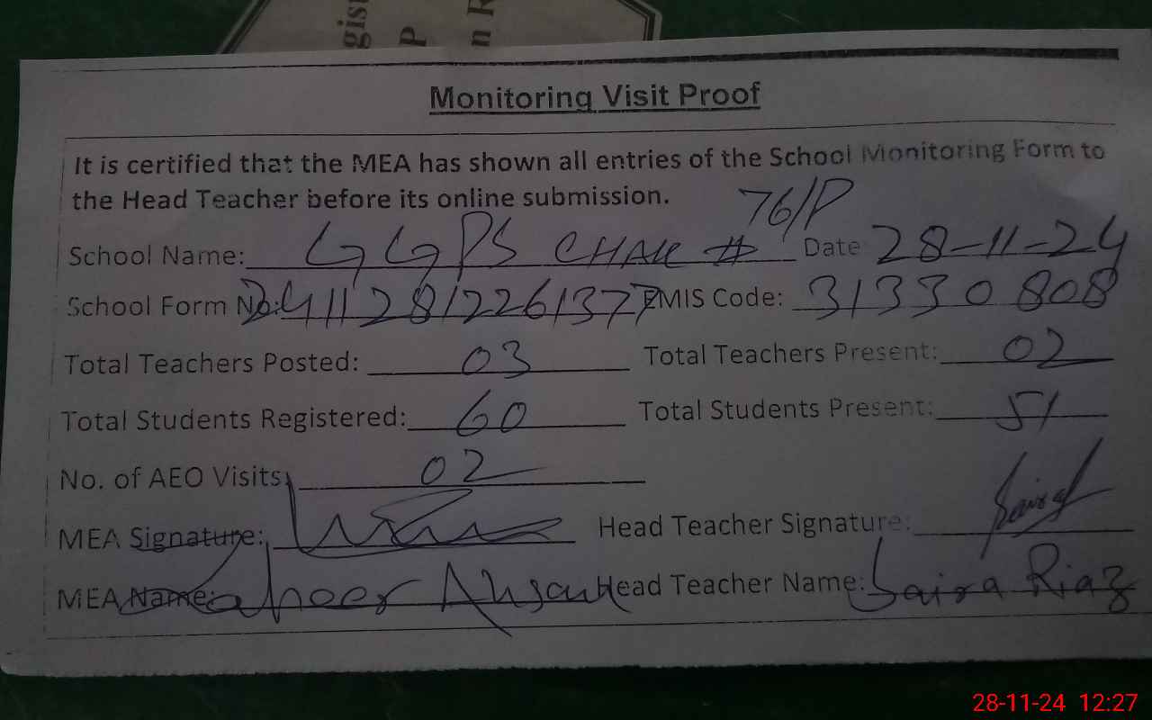 | Monitoring Date: 28-11-2024 | Start Time: 28-11-2024 11:56 AM | End Time: 28-11-2024 12:32 PM | Name of MEA: Za**** Ah**** | |