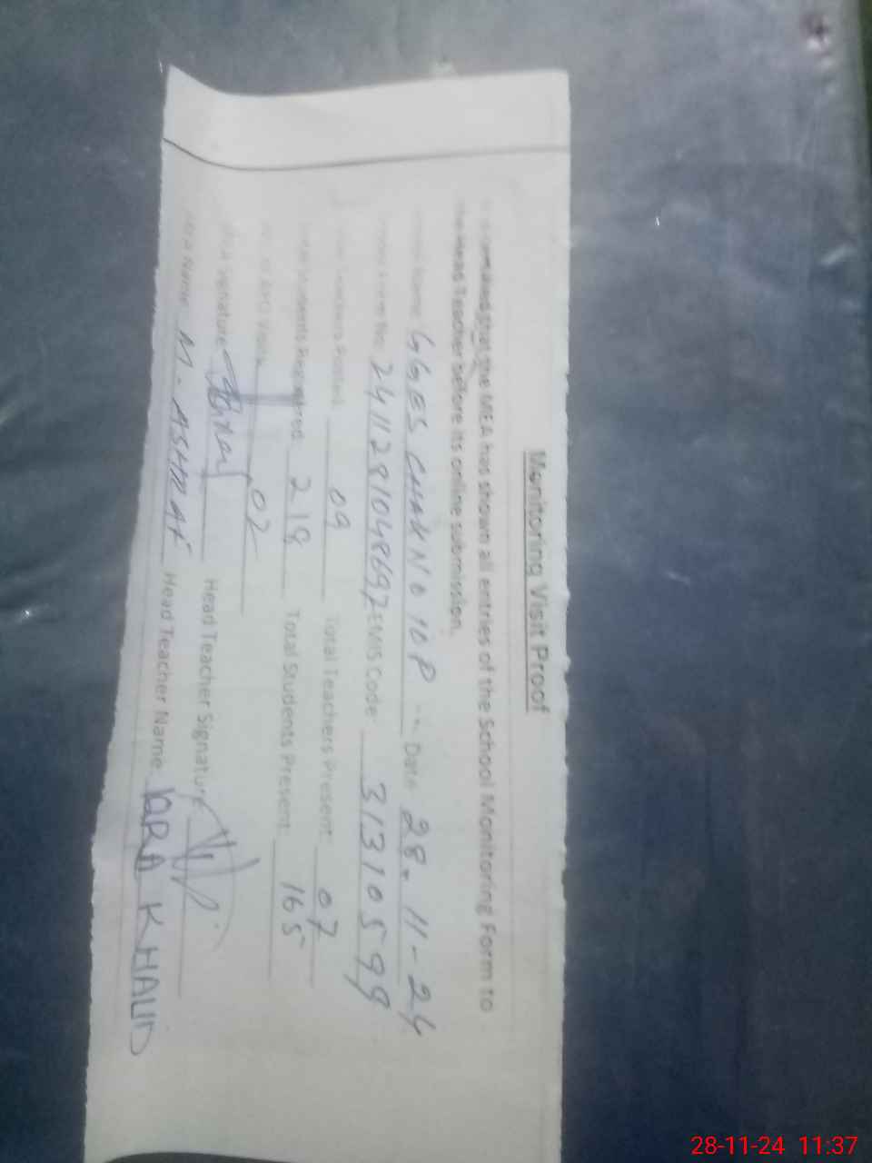 | Attendance Register | Head Teacher | MEA with School | Visit Proof |