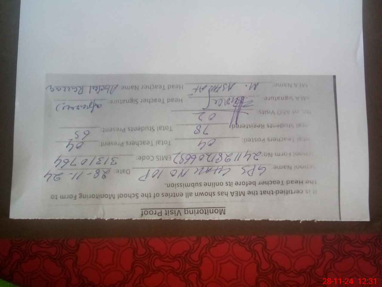| Attendance Register | Head Teacher | MEA with School | Visit Proof |