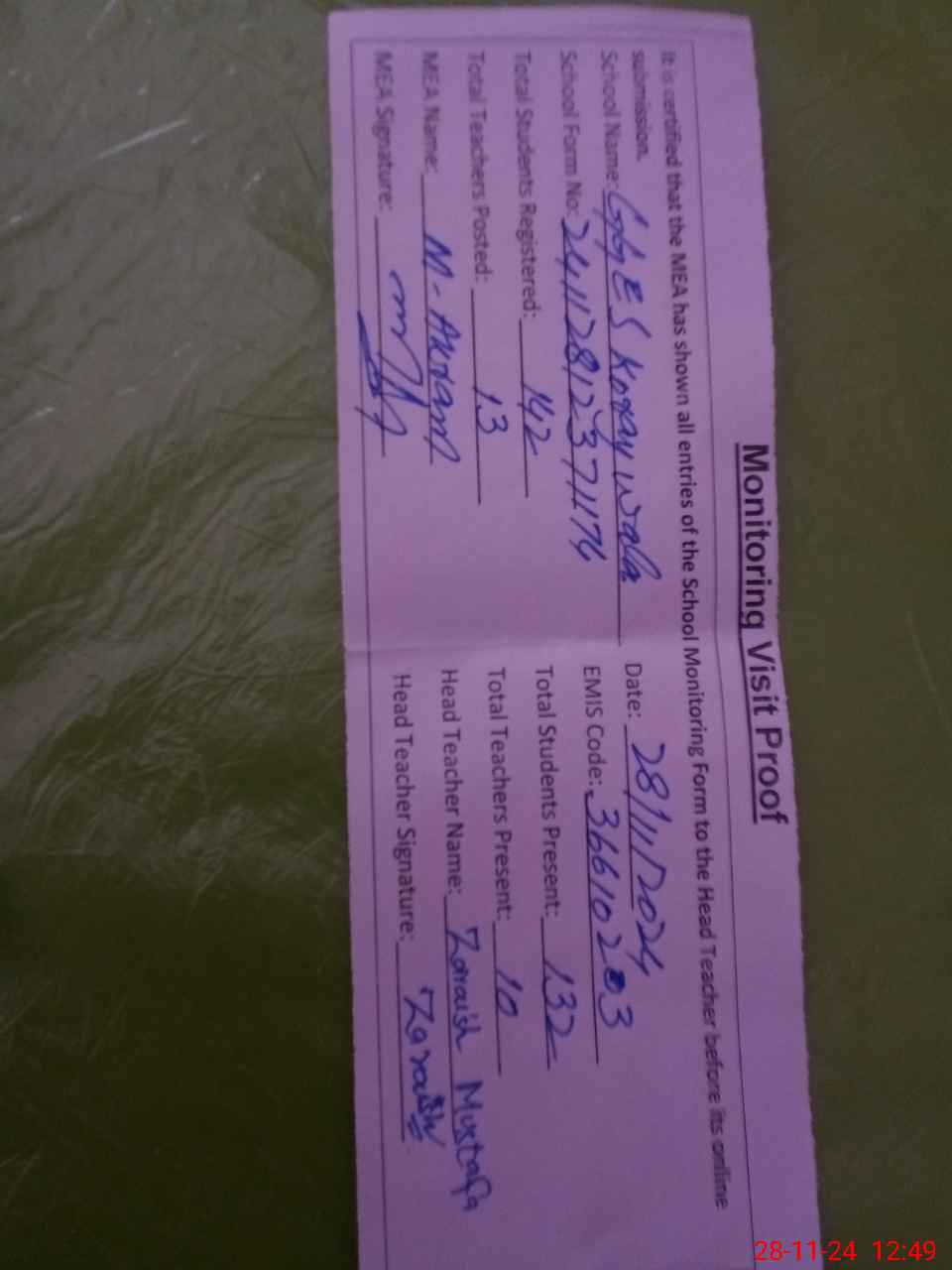 | Attendance Register | Head Teacher | MEA with School | Visit Proof |