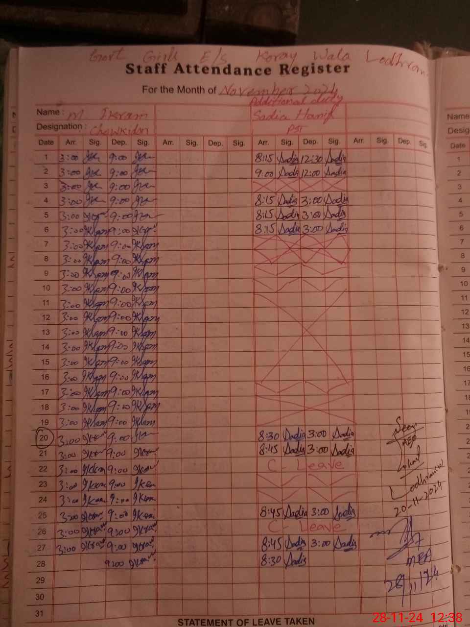 | CNIC | Full Name | Designation | R/C | Absence During Last Calender Month |