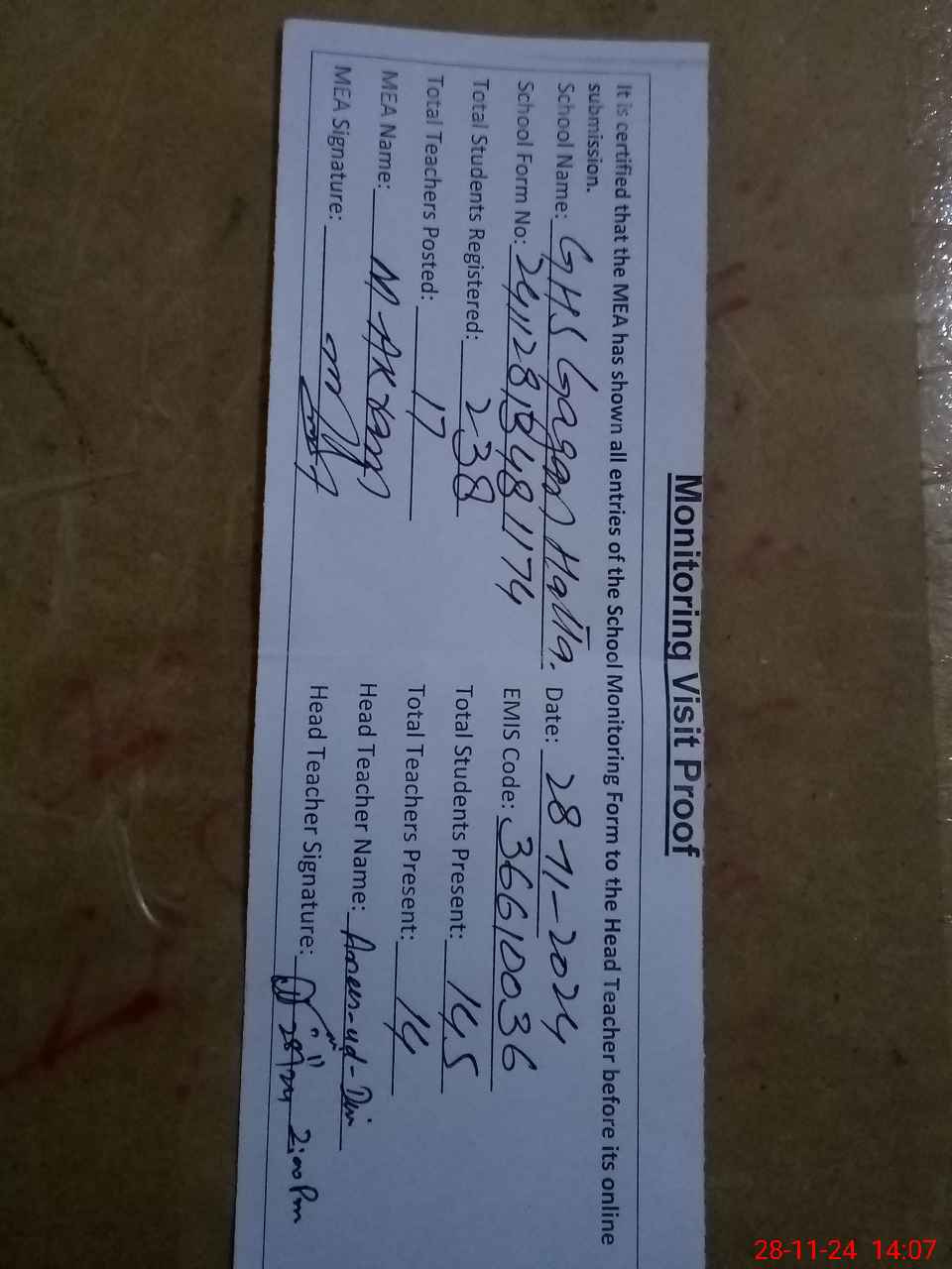 | Attendance Register | Head Teacher | MEA with School | Visit Proof |