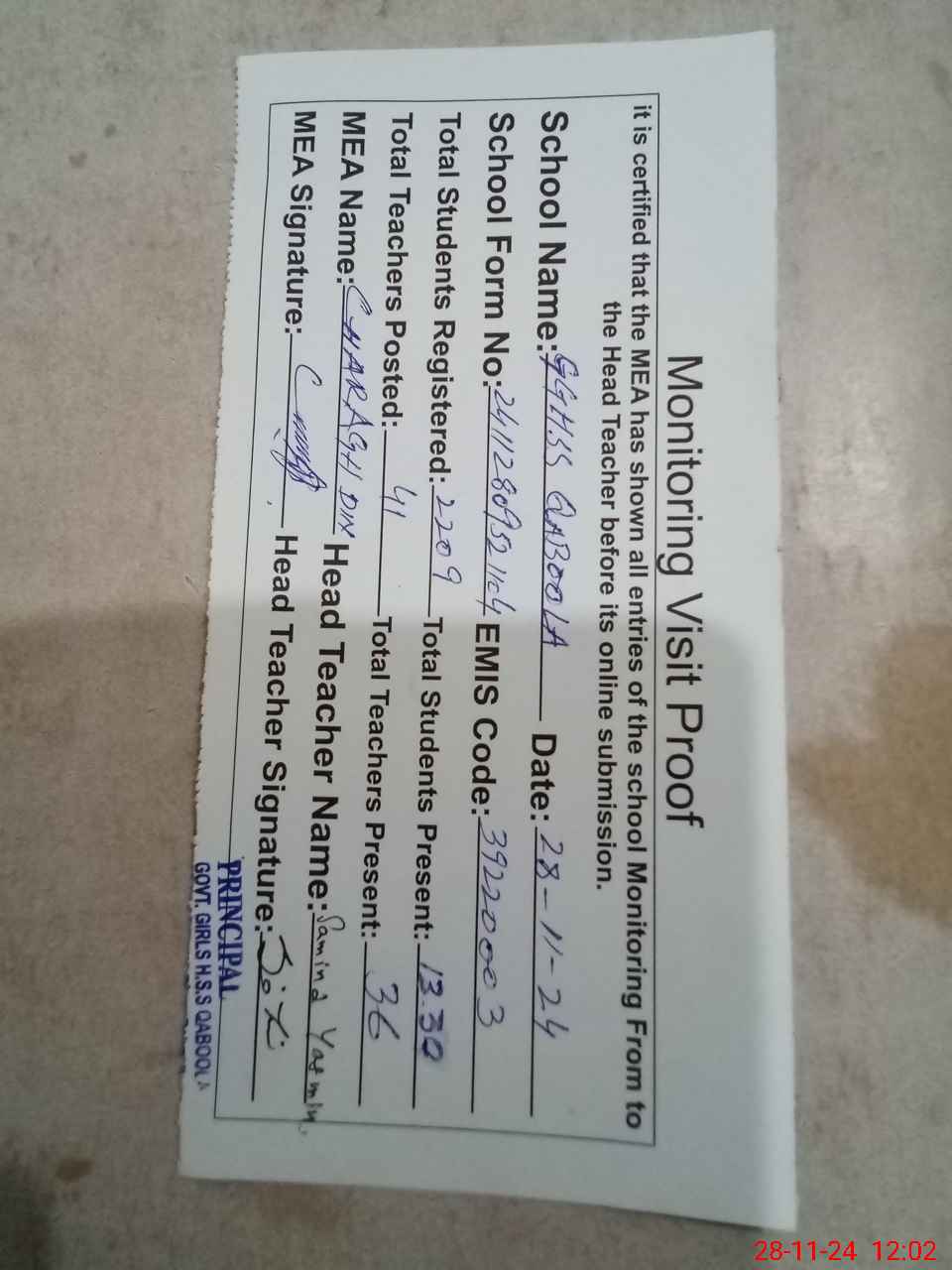 | EMIS Code: 39220003 | Name of School: GGHSS QABOOLA, ARIFWALA | |||