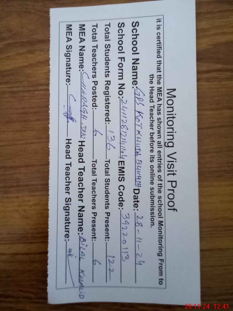| Attendance Register | Head Teacher | MEA with School | Visit Proof |