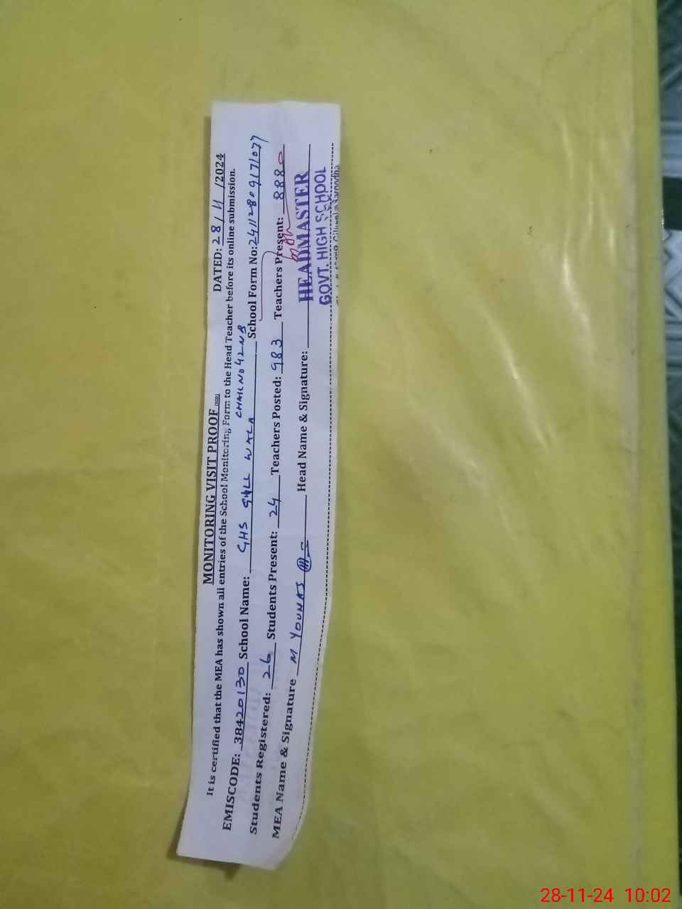 | Attendance Register | Head Teacher | MEA with School | Visit Proof |