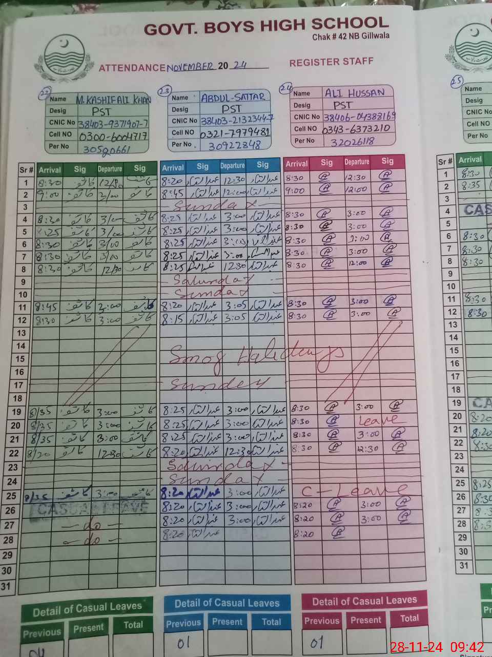 | CNIC | Full Name | Designation | R/C | Absence during last cal. month |