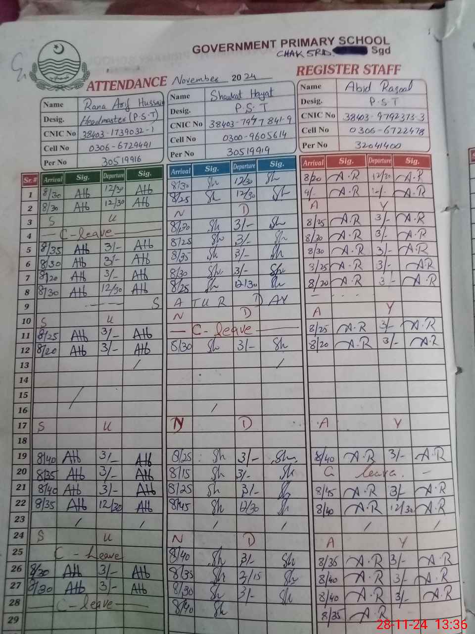 | CNIC | Full Name | Designation | R/C | Absence during last cal. month |