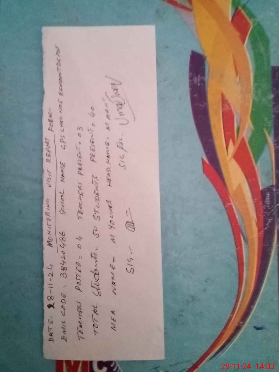 | Attendance Register | Head Teacher | MEA with School | Visit Proof |