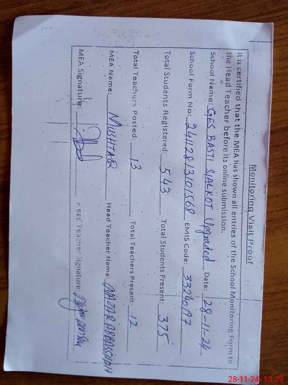 | Attendance Register | Head Teacher | MEA with School | Visit Proof |