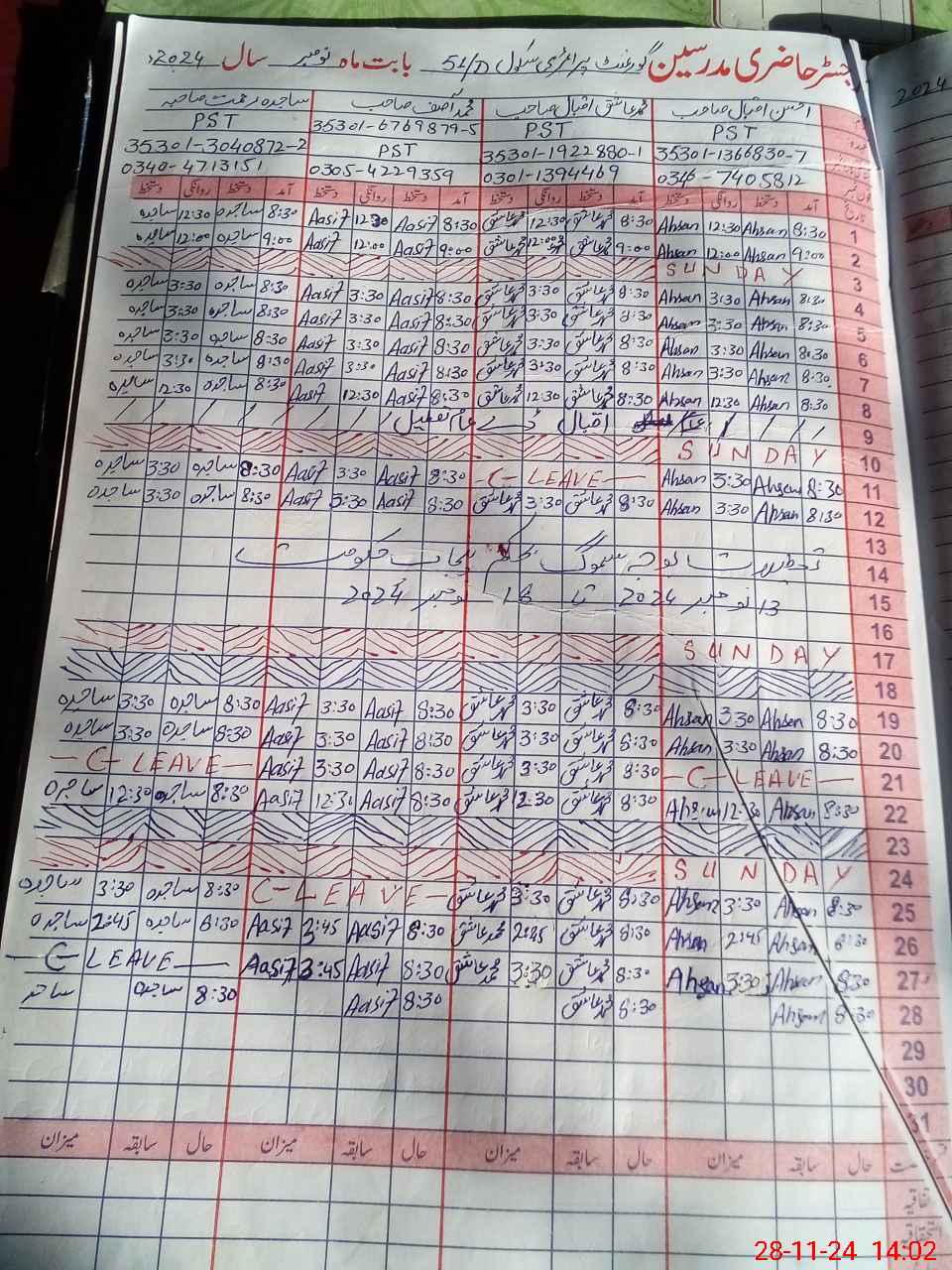 | CNIC | Full Name | Designation | R/C | Absence During Last Calender Month |
