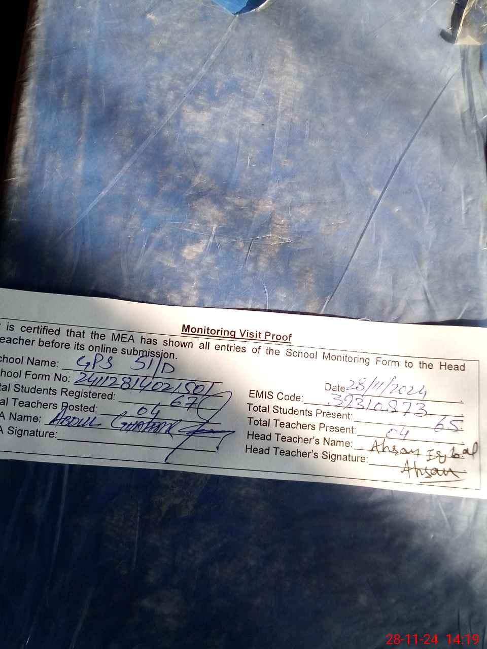 | Attendance Register | Head Teacher | MEA with School | Visit Proof |