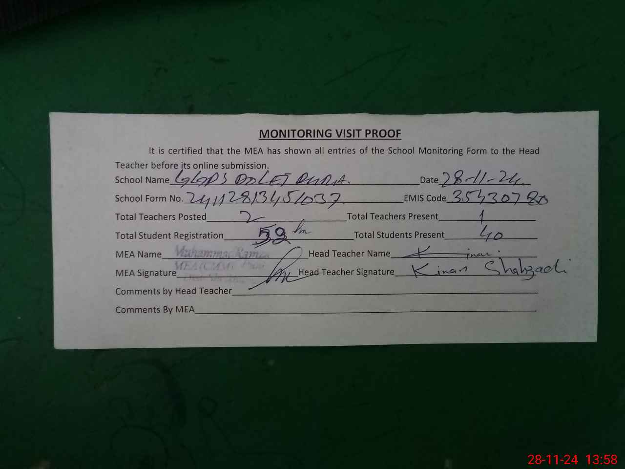 | Attendance Register | Head Teacher | MEA with School | Visit Proof |
