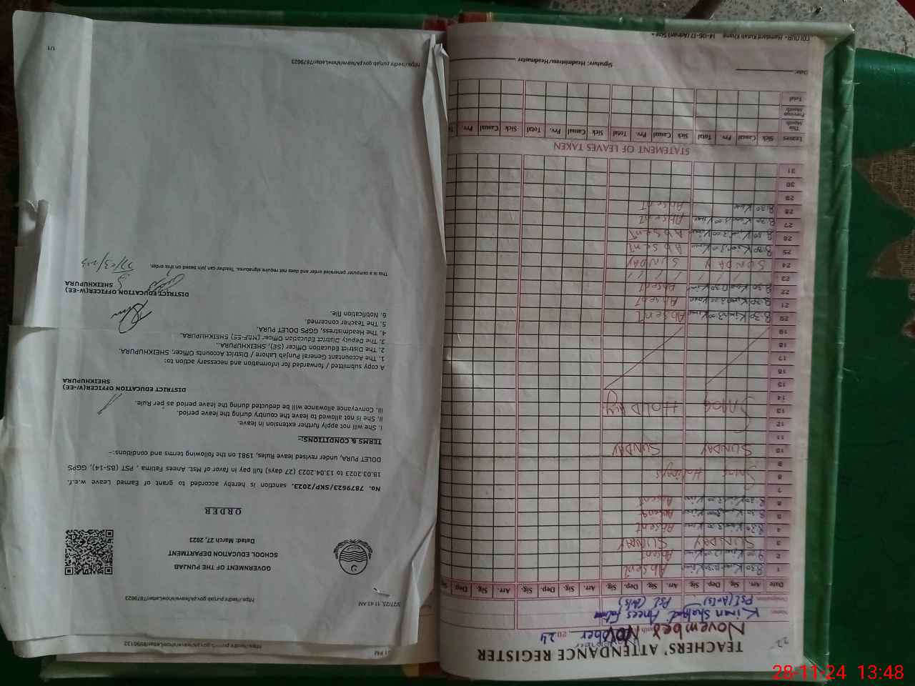 | Remarks (Use Separate Page if Required): Teacher Anees Fatima Pst was granted extra ordinary leave since 18 march 2023 up to 18 oct 2024 But she ABSENTED herself since 19 oct 2024 So marked her as absent | |||||