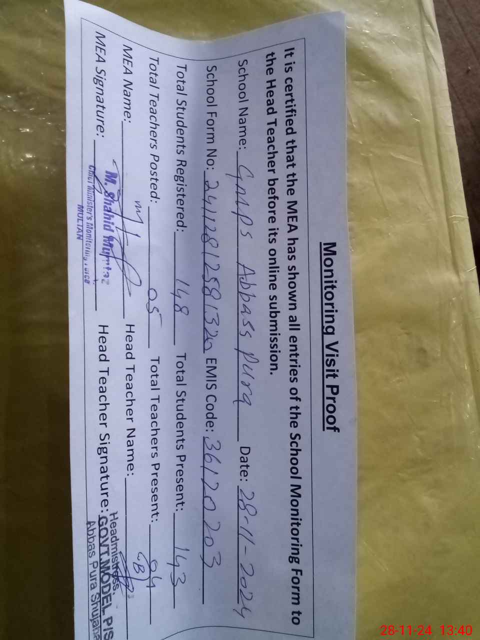 | Attendance Register | Head Teacher | MEA with School | Visit Proof |