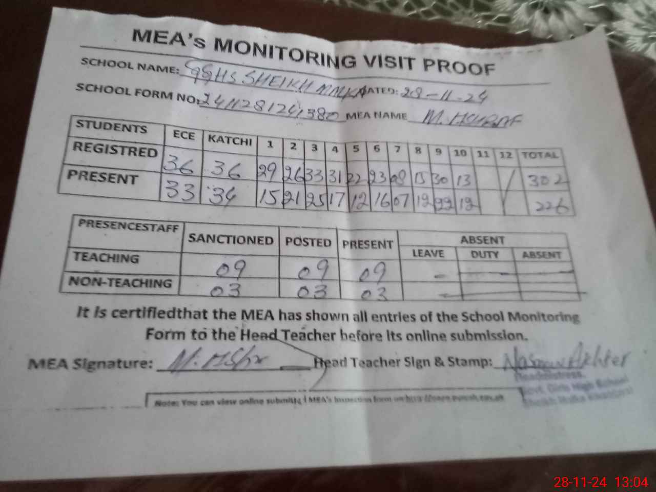 | Attendance Register | Head Teacher | MEA with School | Visit Proof |