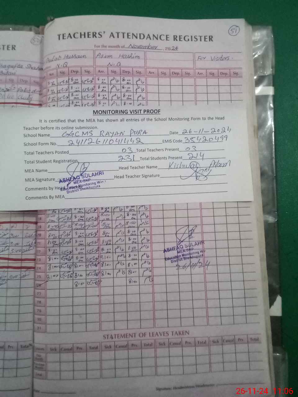 | Attendance Register | Head Teacher | MEA with School | Visit Proof |