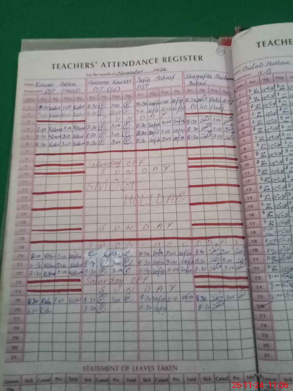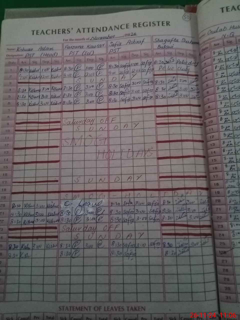 | Leave | Duty | Absent | Maternity | Medical | Ex- Pak |