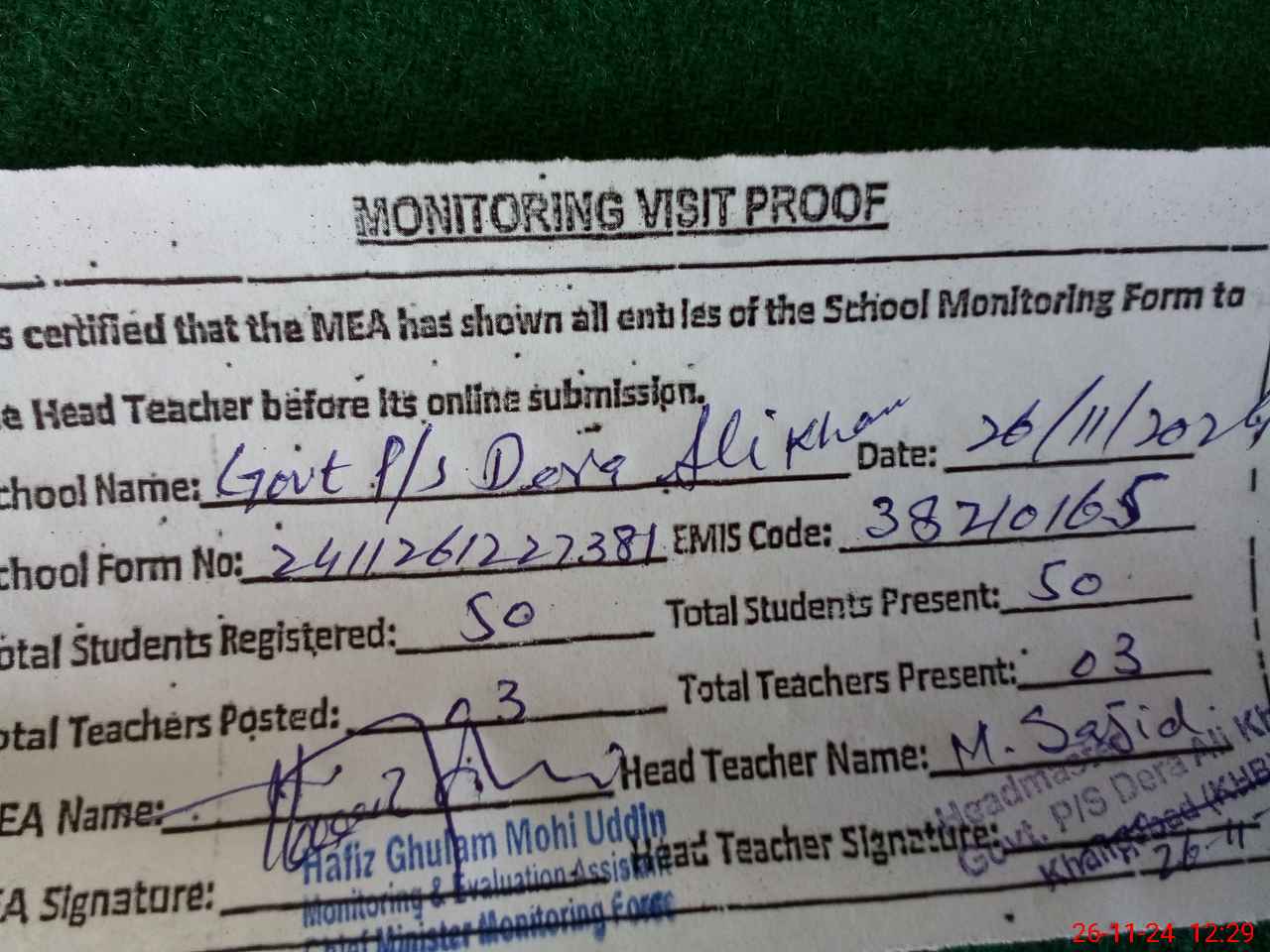 | Attendance Register | Head Teacher | MEA with School | Visit Proof |