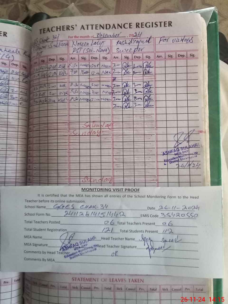 | Attendance Register | Head Teacher | MEA with School | Visit Proof |