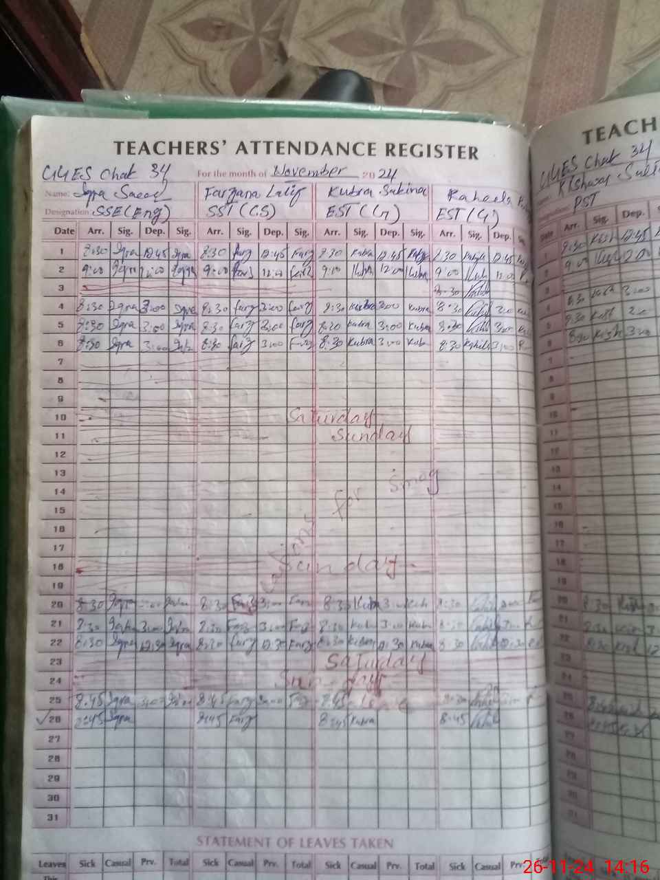 | Leave | Duty | Absent | Maternity | Medical | Ex- Pak |
