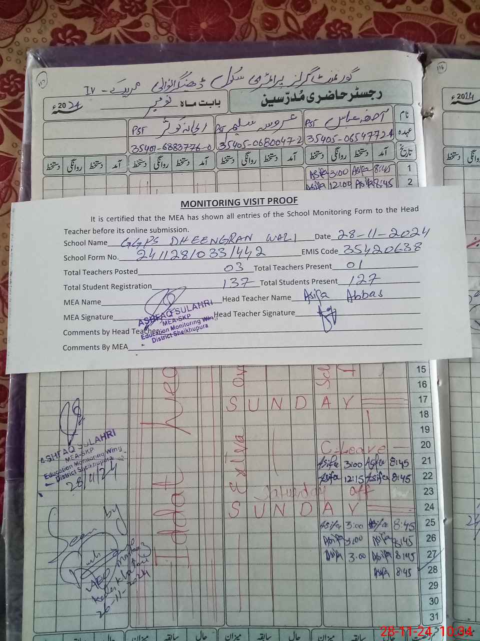 | Attendance Register | Head Teacher | MEA with School | Visit Proof |