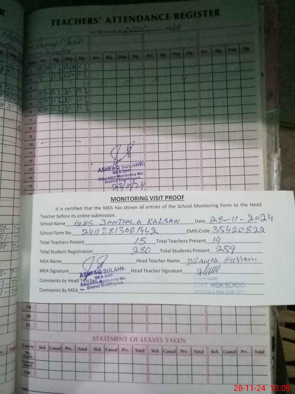 | Attendance Register | Head Teacher | MEA with School | Visit Proof |