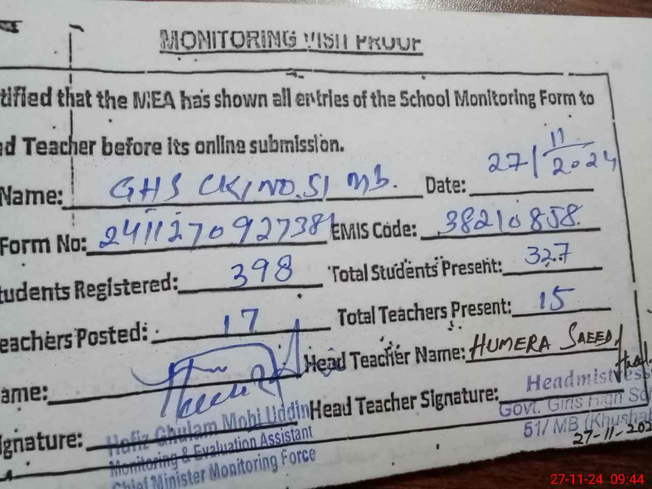 | Monitoring Date: 27-11-2024 | Start Time: 27-11-2024 09:15 AM | End Time: 27-11-2024 09:46 AM | Name of MEA: HA**** GH**** MO**** UDDI**** | |