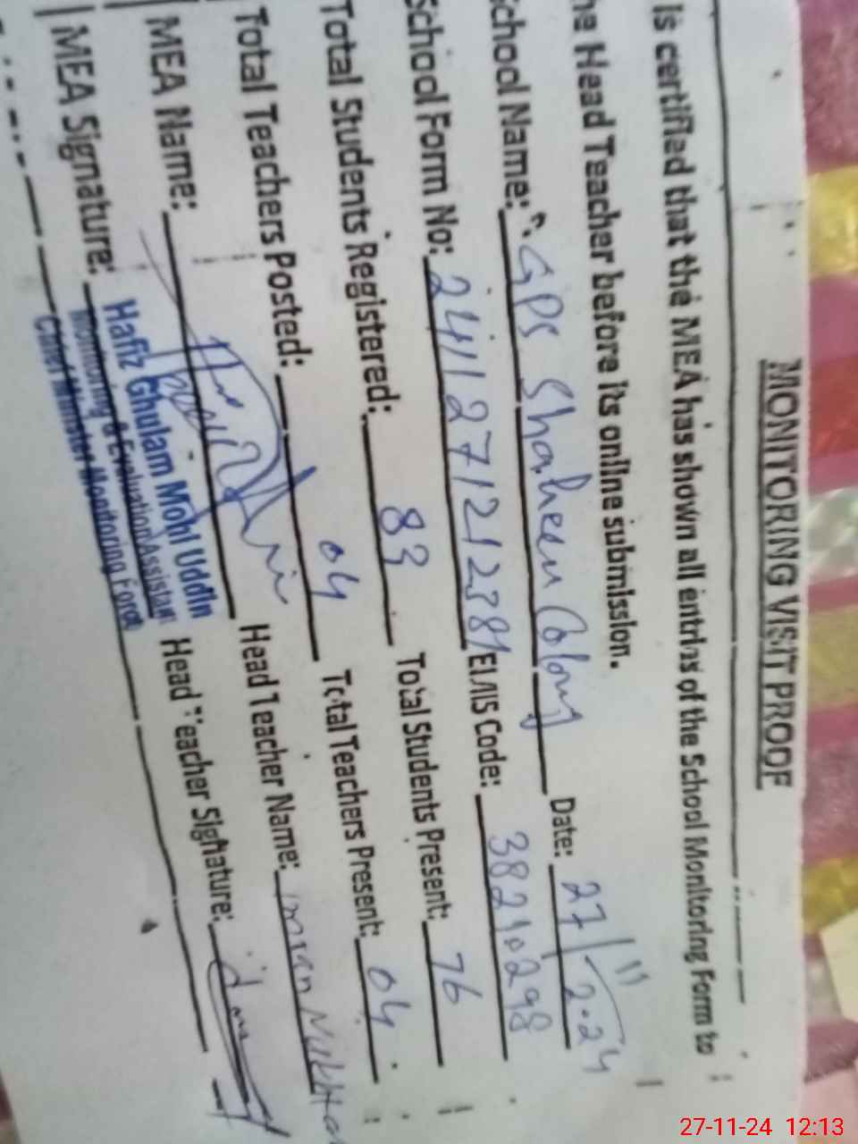 | Attendance Register | Head Teacher | MEA with School | Visit Proof |