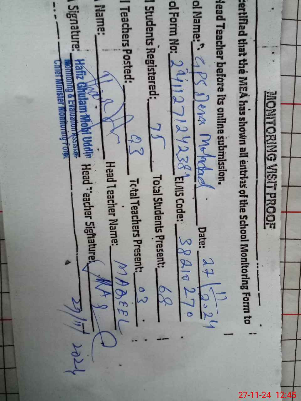 | Certified that this School was Inspected by the Undersigned MEA/DMO Today and the Information Stated Above is as Per Record. | |||||
