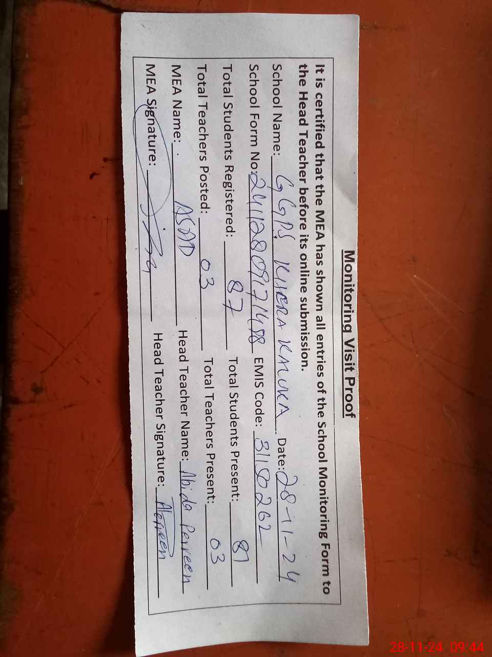 | Attendance Register | Head Teacher | MEA with School | Visit Proof |