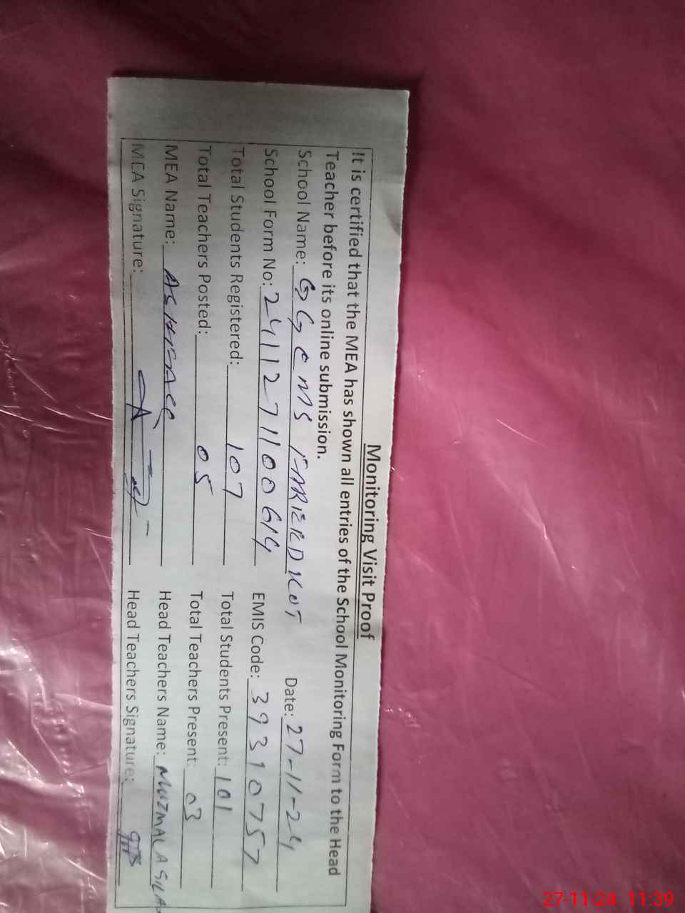 | Attendance Register | Head Teacher | MEA with School | Visit Proof |