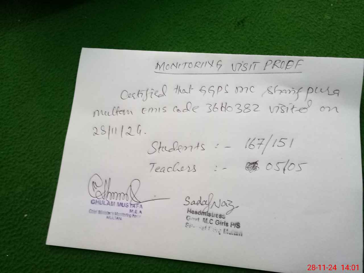 | Certified that this School was Inspected by the Undersigned MEA/DMO Today and the Information Stated Above is as Per Record. | |||||