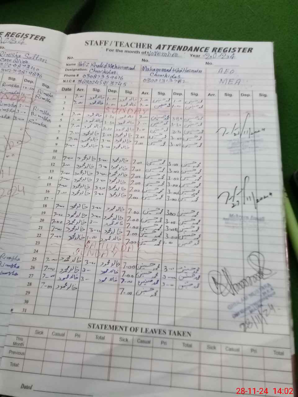 | CNIC | Full Name | Designation | R/C | Absence During Last Calender Month |