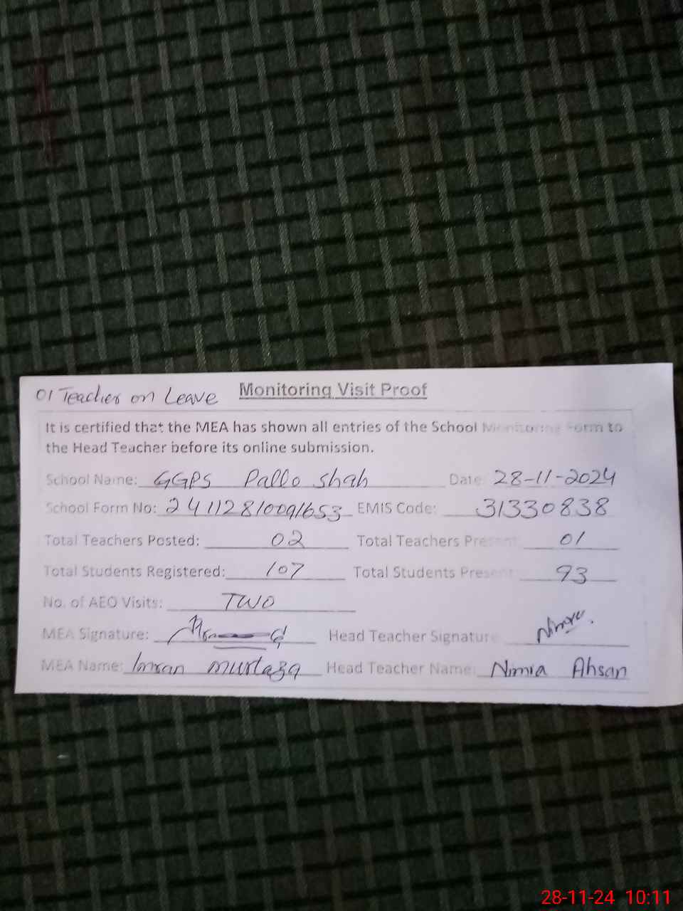 | Monitoring Date: 28-11-2024 | Start Time: 28-11-2024 09:16 AM | End Time: 28-11-2024 10:12 AM | Name of MEA: Im**** Mu**** | |