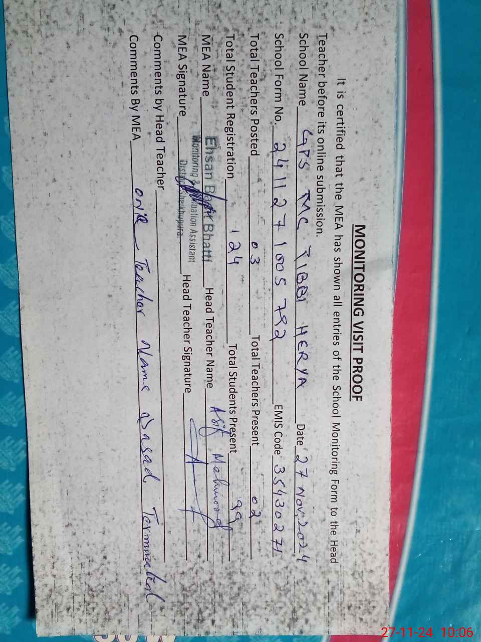 | Attendance Register | Head Teacher | MEA with School | Visit Proof |