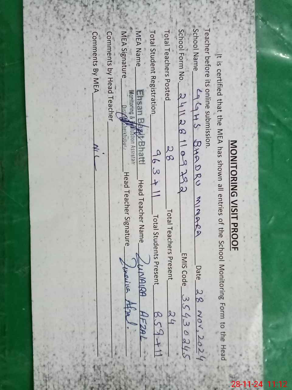 | EMIS Code: 35430245 | Name of School: GGHS BHADRU MINARA | |||