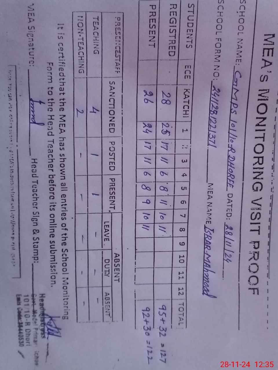 | Attendance Register | Head Teacher | MEA with School | Visit Proof |