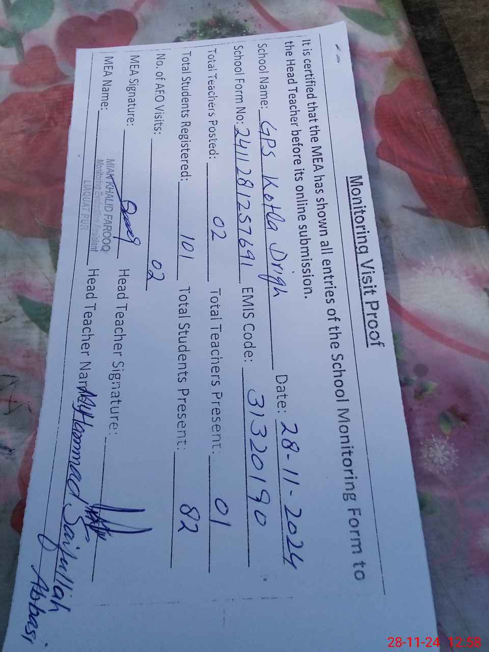 | Attendance Register | Head Teacher | MEA with School | Visit Proof |