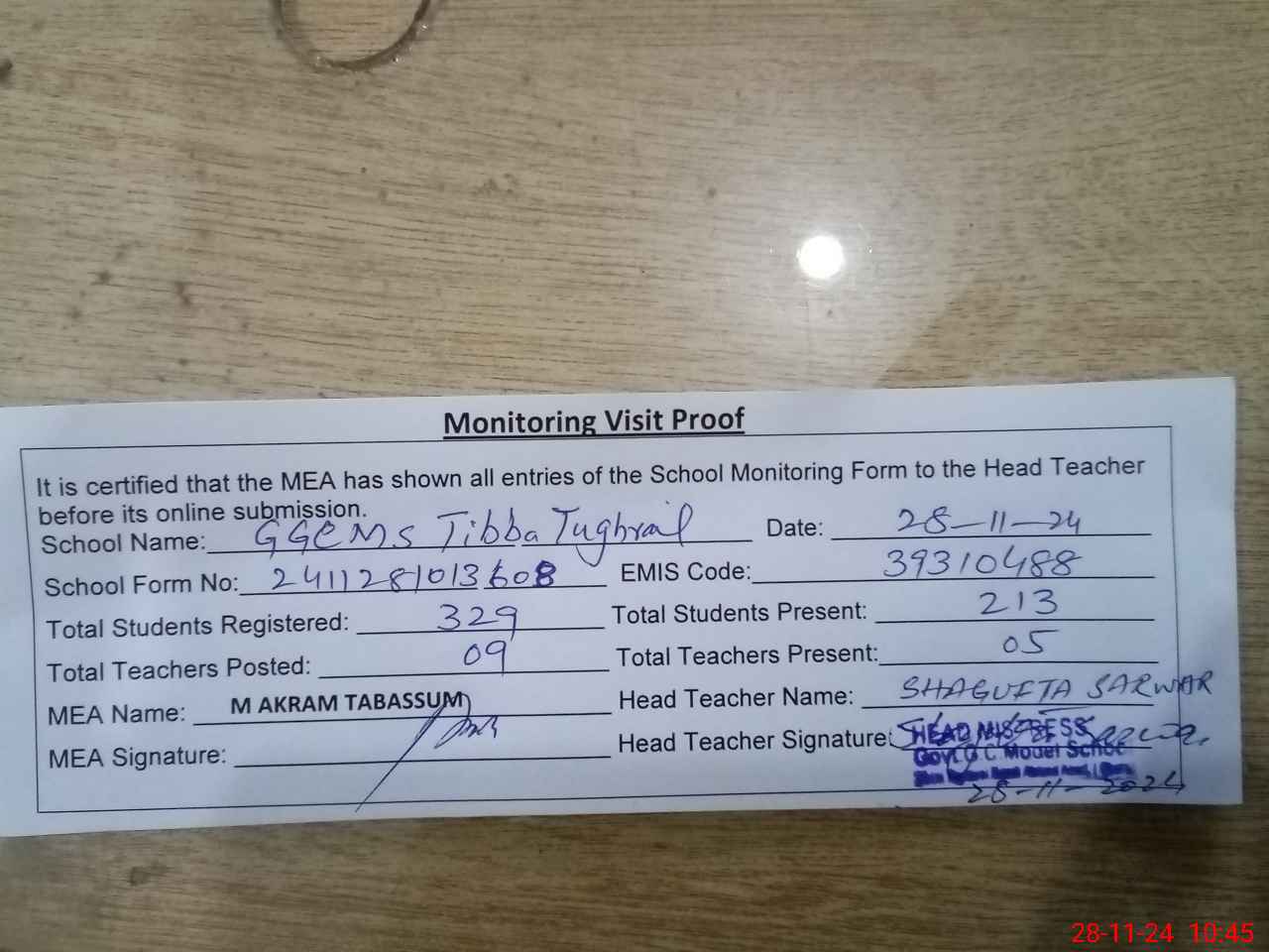 | Attendance Register | Head Teacher | MEA with School | Visit Proof |
