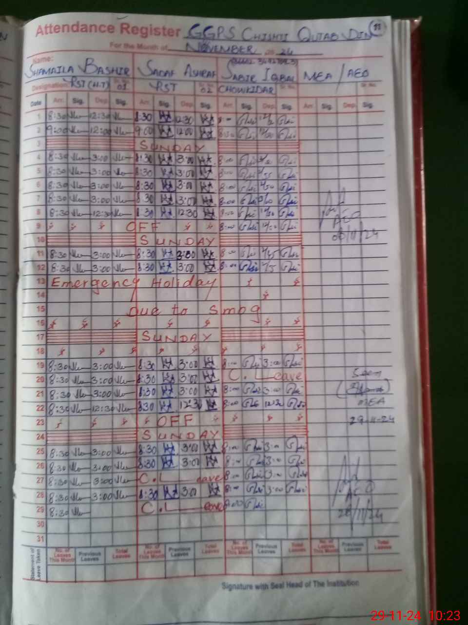 | Monitoring Date: 29-11-2024 | Start Time: 29-11-2024 10:12 AM | End Time: 29-11-2024 10:43 AM | Name of MEA: MU**** AK**** (R**** | |