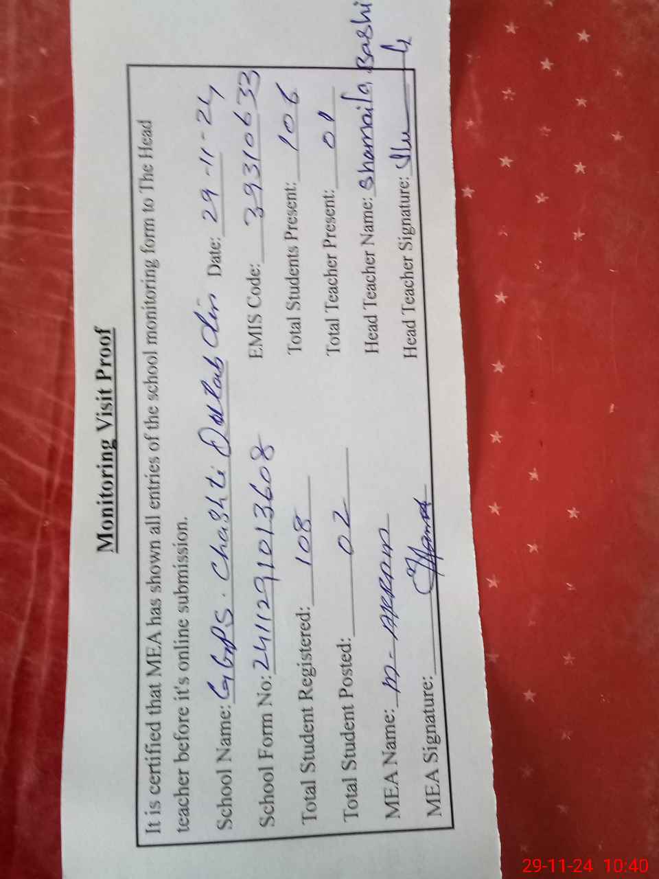 | Attendance Register | Head Teacher | MEA with School | Visit Proof |