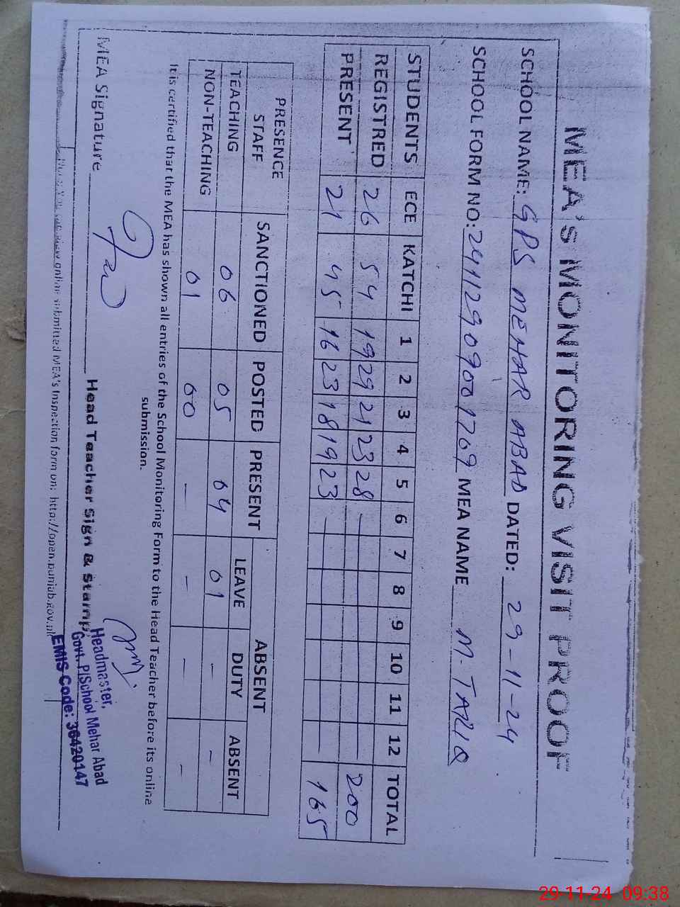 | EMIS Code: 36420147 | Name of School: GPS MEHAR ABAD, KHANEWAL | |||