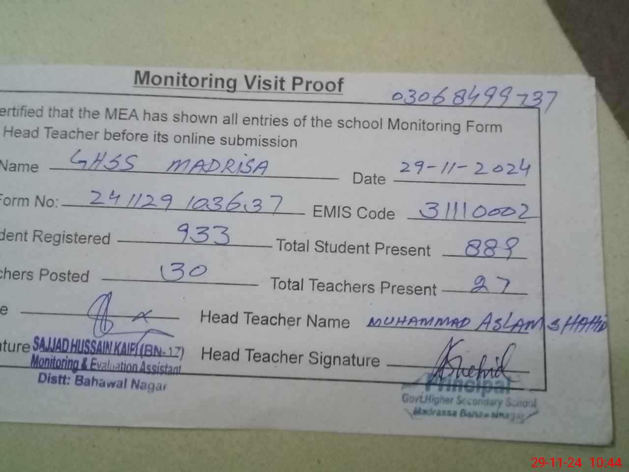 | Name: MAS**** SH**** Designation: (School Headmaster's/Headmistress's) Principal Phone/Cell Number: 03**** |