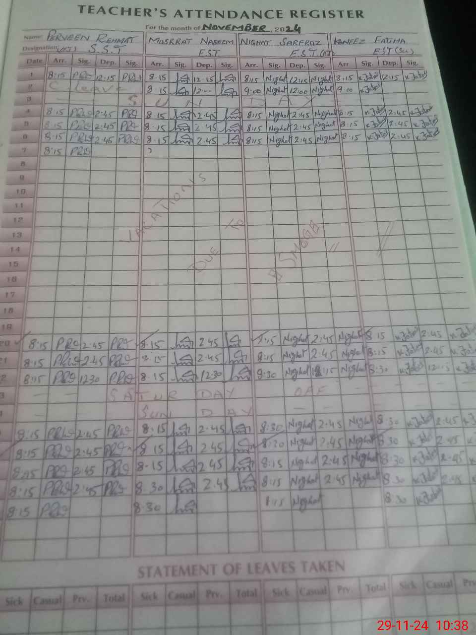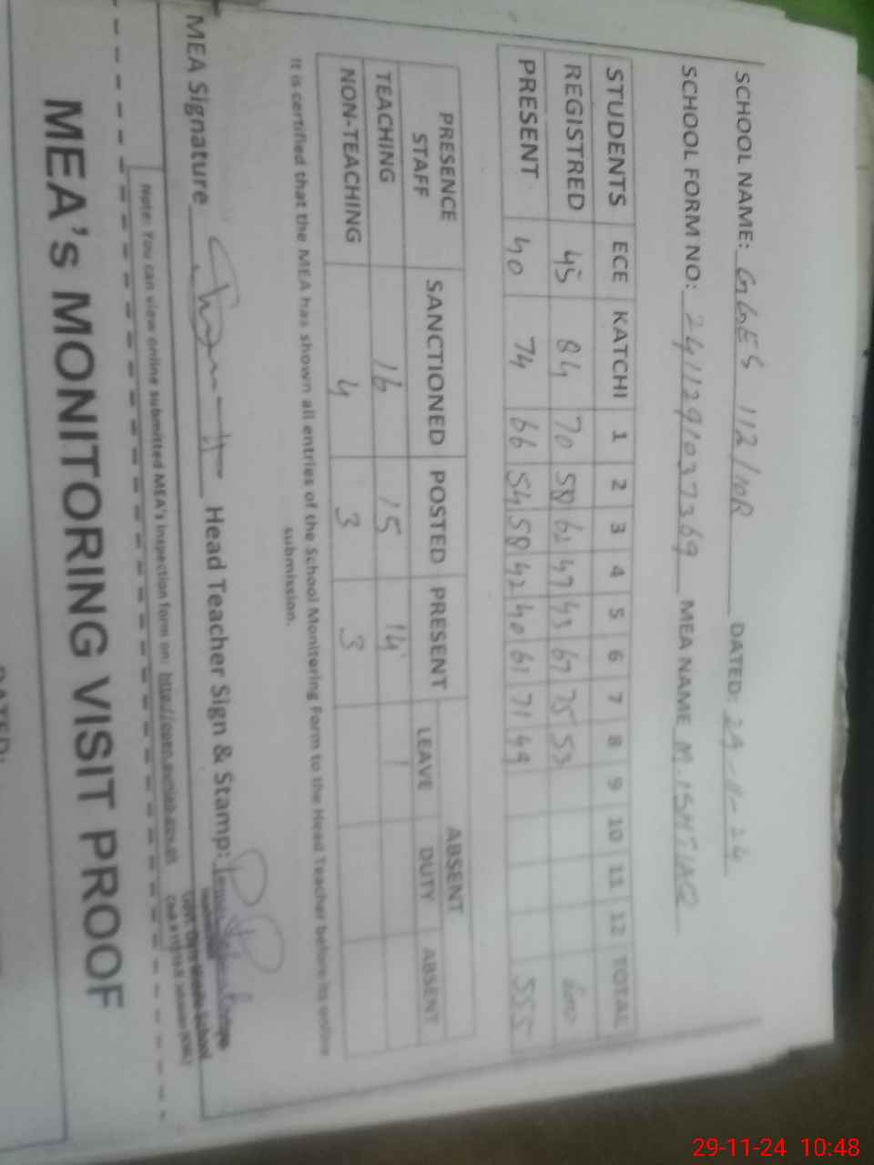 | Monitoring Date: 29-11-2024 | Start Time: 29-11-2024 10:10 AM | End Time: 29-11-2024 11:01 AM | Name of MEA: M.Is**** (S**** 03**** | |